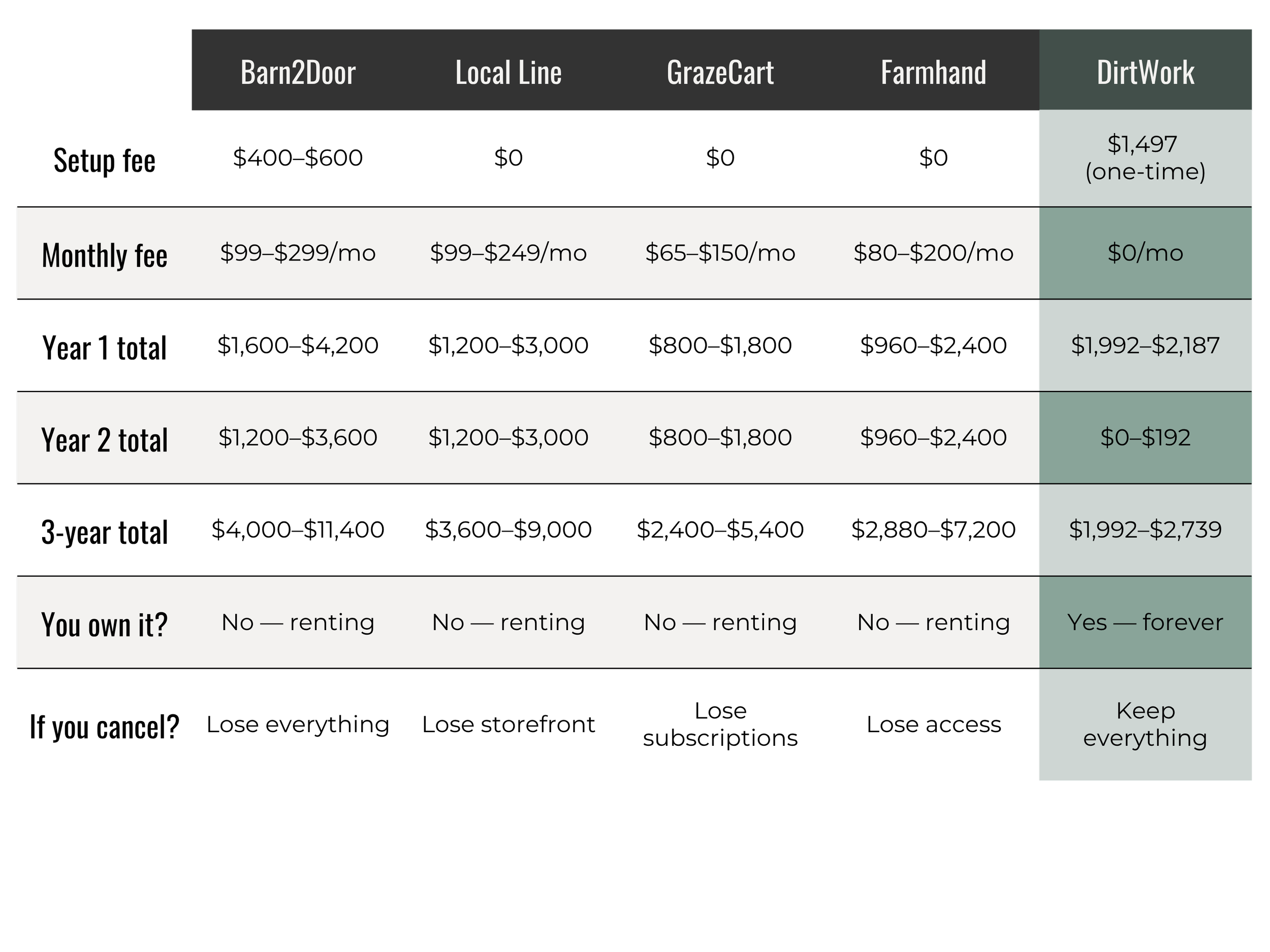 Platforms like Barn2Door, Local Line, and GrazeCart charge $99–$299/month and you're renting their system. Cancel, and you lose everything. With DirtWork, you pay once ($1,497) and own the system forever. Over 3 years, you'll save $1,200–$8,600 compared to those platforms.